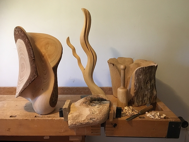 Hier in der Werkstatt für antike Holzmöbel sind die Skulpturen von Barbara Guthy zu sehen