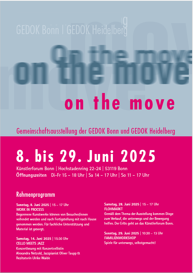 Die jurierte Gemeinschaftsausstellung ON THE MOVE wird mit Künstlerinnen der GEDOK Bonn und Heidelberg an zwei Orten gezeigt: