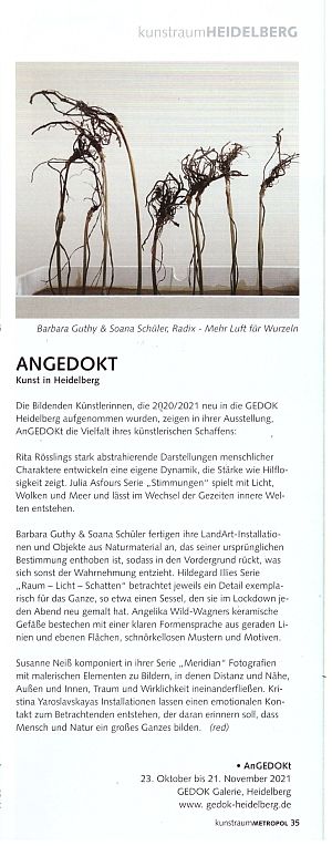 Ausstellung in der GEDOK-Galerie mit den "Neuzugängen" im Bundesverband Bildender Künstlerinnen. Zu sehen ist auch Objektkunst von Barbara Guthy und Soana Schüler.